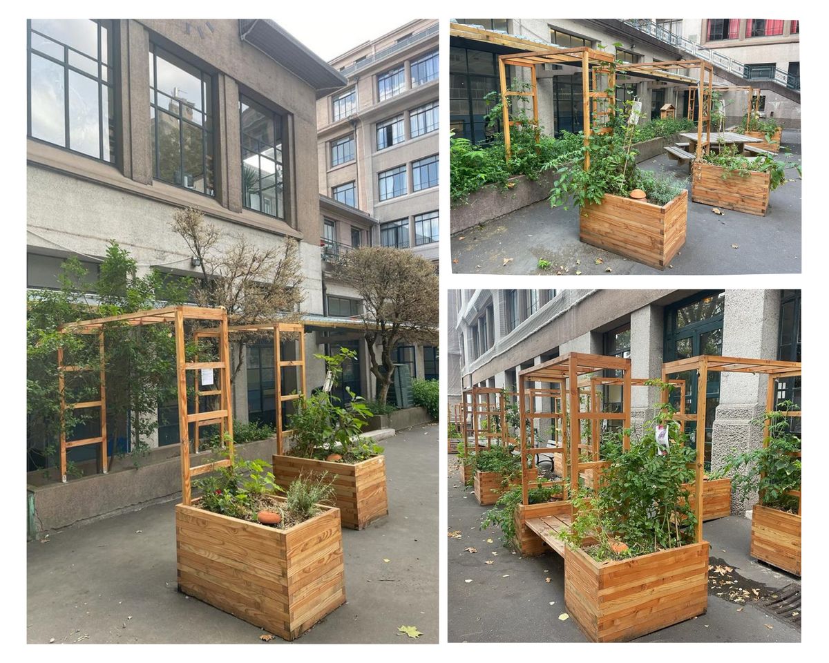 Des bacs de cultures de plantes réalisés à l'adresse d'écoles pour apporter des espaces de verdure dans des lieux artificialisés.